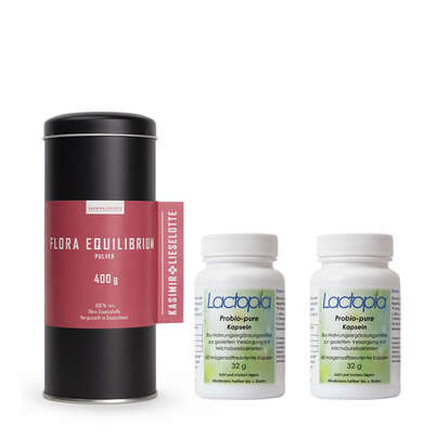 Flora-Equilibrium-Pulver (400 g) Lactopia-Probio-pure-Kapseln (2 x 60 Stück) Die Kur ist für den Zeitraum von 8 Wochen ausgelegt, eine ausführliche Kurbeschreibung ist in jeder Bestellung enthalten. Alle Produkte der Darmsanierung-Kur-BASIC-1 sind in in gewohnt hoher Kasimir + Lieselotte Qualität: